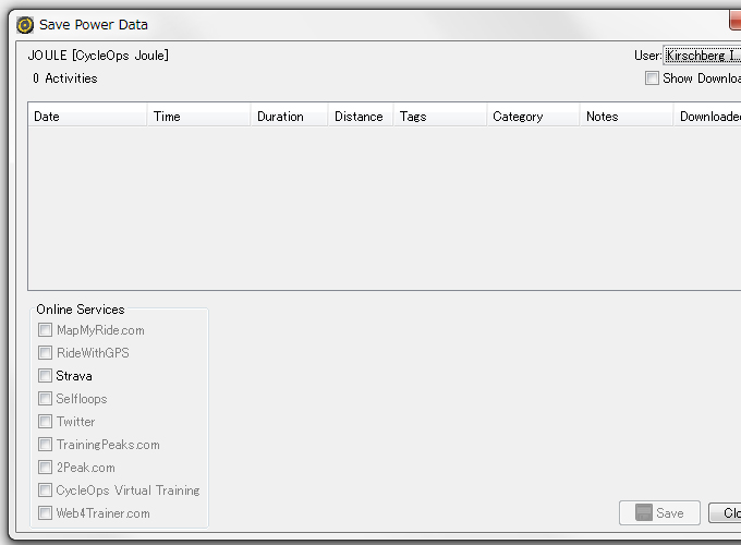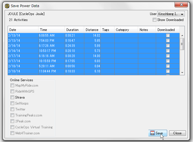 ジュールに保存されているライドデータの一覧が表示されるので、ダウンロードしたい行を選択し、[Save]ボタンをクリックします。