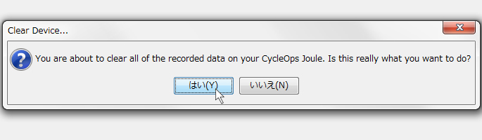 "You are about to clear all of the recorded data on your CycleOps Joule. Is this really what you want to do?"というメッセージが表示されます。これは「データはPowerAgentにダウンロードしたので、ジュールから削除してもいいですか?」という意味です。ジュールのメモリスペースを確保するため、ここは常に[はい]を選択することをお勧めします。ジュール内のヒストリーデータは削除されませんのでご安心ください。